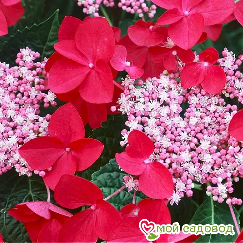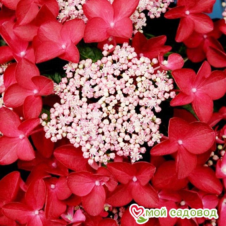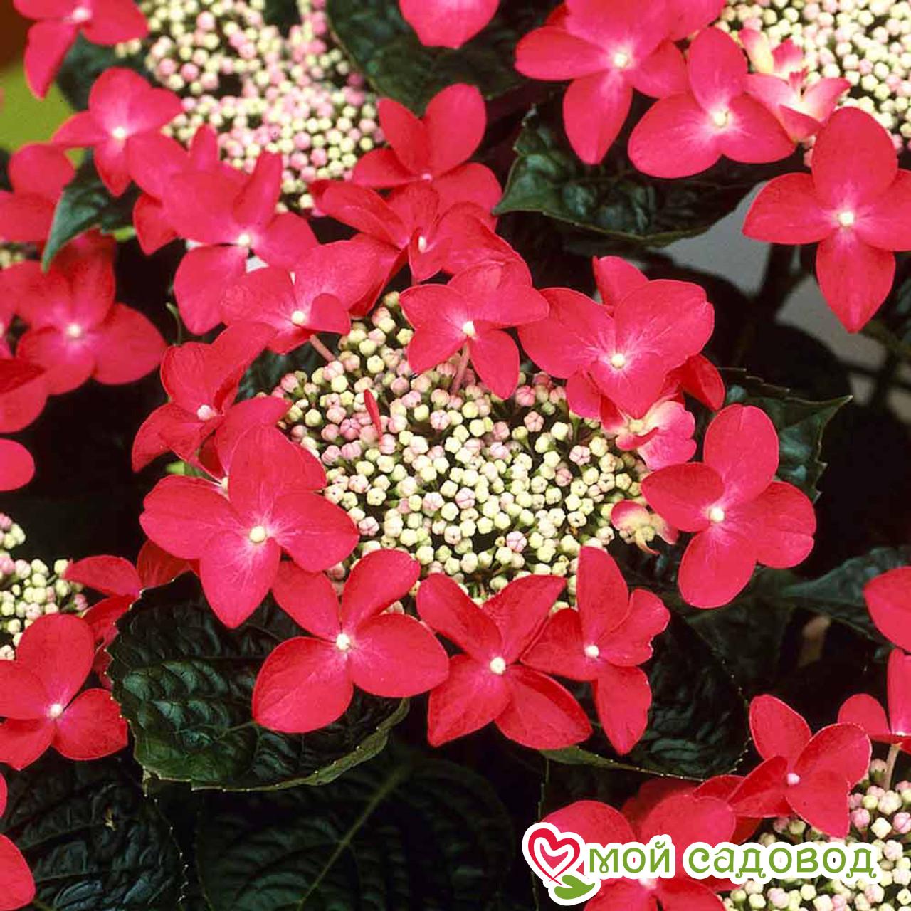 Куст высотой 150 см округлой формы. Листва темно-зеленая, осенью-красная. Соцветия огромные (до 22см!) плоские, состоящими из крупных краевых цветков бордово-красного цвета и мелких розовых цветочков в центре. На кислых почвах окраска прицветников становится пурпурной, почти фиолетовой. Предпочитает влажные, проницаемые, перегнойные почвы,  слабокислые или близкие к нейтральным, не переносит известковые. Хорошо себя чувствует в полутени. Очень влаголюбива.  Дымогазоустойчива, поэтому идеально подходит для выращивания в условиях города.  Требует обрезки слабых и прошлогодних побегов. Морозостойкость средняя: выдерживает  понижения температуры до  -20°C мороза. Поэтому данный сорт требует тщательного укрытия на зиму. Соцветия после отцветания можно оставить – они имеют привлекательный вид. В нашем интернет-магазине вы сможете купить Гортензия Так же возможно вас заинтересуют Гранат красный «Крымский полосатый» и Гранат Гюлоша розовая .